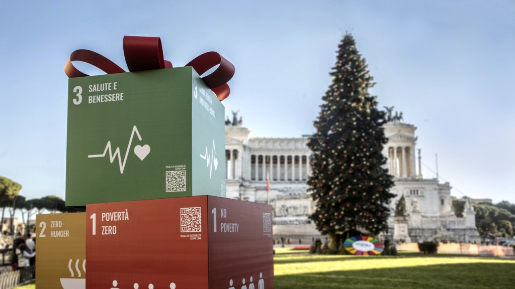 Quest’anno per i cittadini di Roma il Natale sarà all’insegna della sostenibilità. Ai piedi del tradizionale albero di Natale in piazza Venezia, inaugurato l’8 dicembre come ogni anno, i romani hanno trovato 17 pacchi regalo corrispondenti ai 17 obiettivi di sviluppo sostenibile dell’agenda 2030 delle Nazioni Unite.